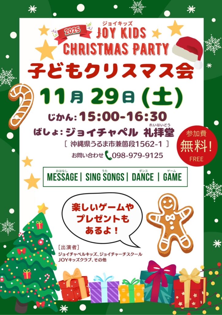 ジョイチャペルキッズ、ジョイチャーチスクール、ジョイキッズクラブのお友達が歌やダンスを準備しています。他にも、ゲームやクリスマスのお話、プレゼントもあります♪